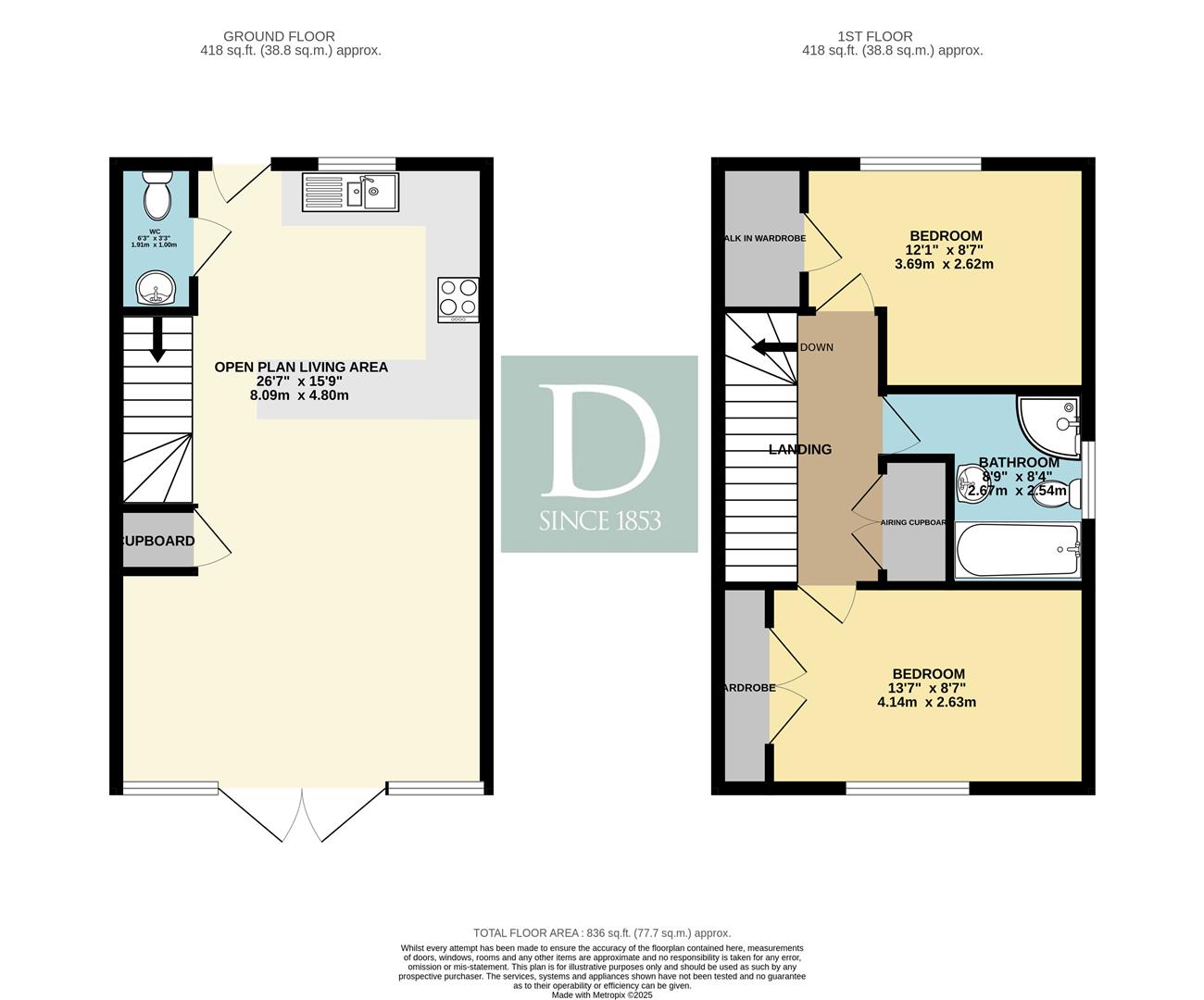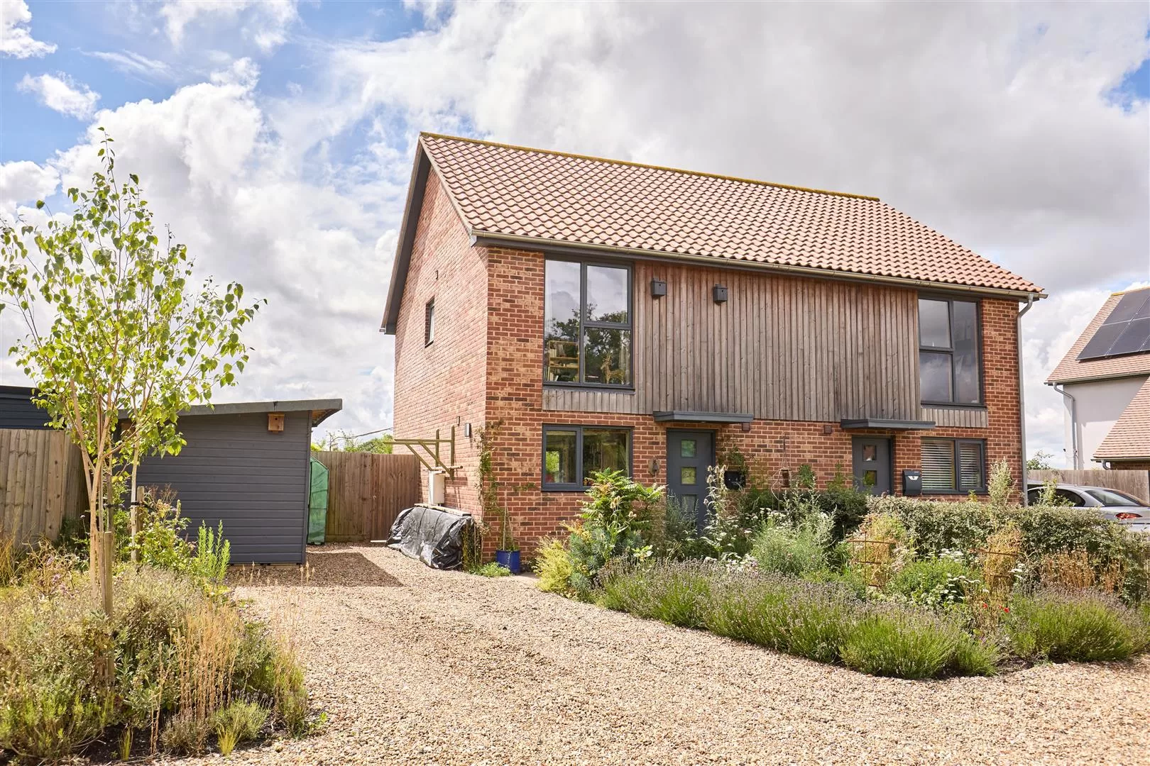 Built in 2020 to an exceptional standard, this striking semi-detached home offers thoughtful, well-presented accommodation within the popular village of Occold. Two sets of planning permission for a double-storey extension & loft conversion further enhances its appeal. The ground floor features a spacious, open-plan living area. A well-fitted kitchen at the front flows seamlessly into the dinning and sitting room, with double doors opening onto the beautifully landscaped rear garden. A convenient cloakroom completes this level. Upstairs two generous double bedrooms boast floor-to-ceiling windows and large built-in wardrobes. The rear bedroom enjoys breath-taking views over the garden and open countryside. A family-sized bathroom serves both bedrooms.