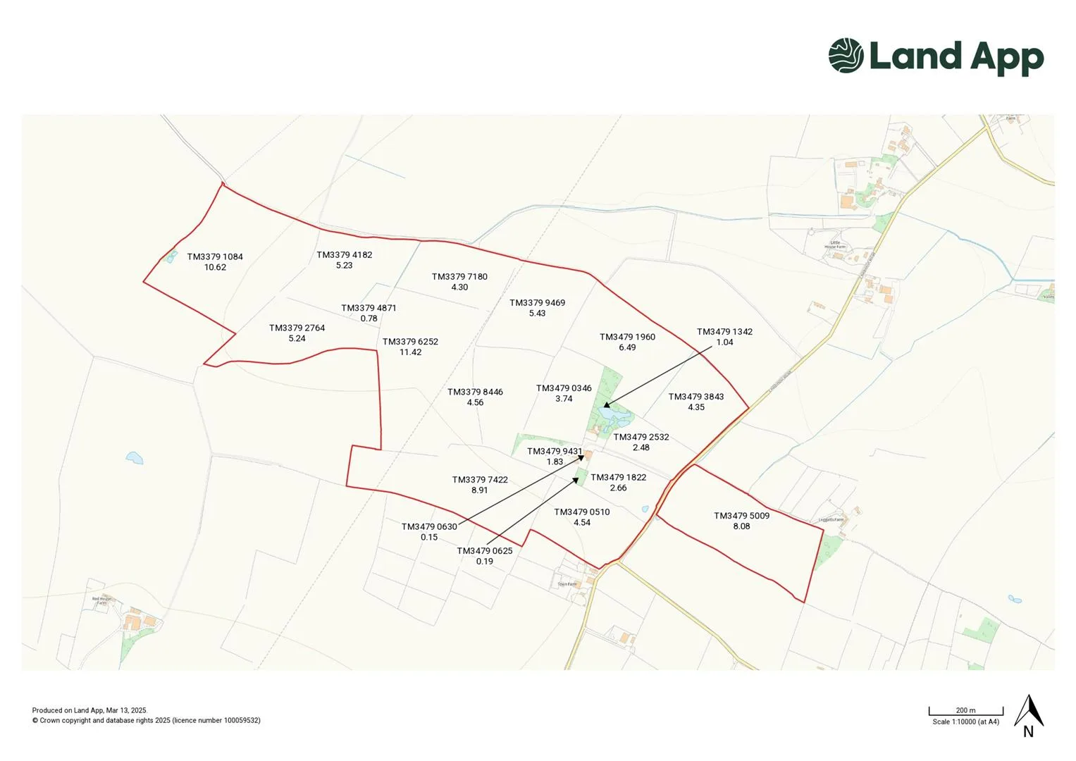 The farmland is contained within 17 enclosures comprising 14 arable fields extending to about 207 acres (83.69 ha) and three permanent grass fields approximately 16 acres (6.58 ha). All of the fields bar one contained within the ring boundary to the west side of Chediston Road most have the have the benefit of hedged boundaries.