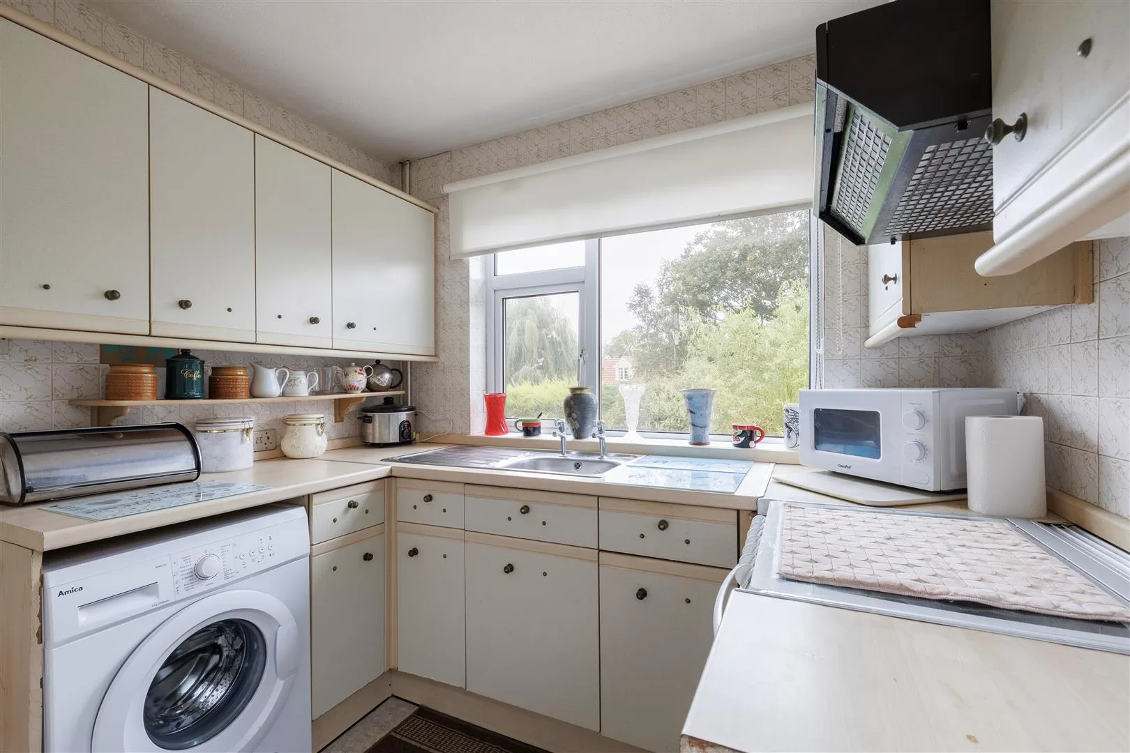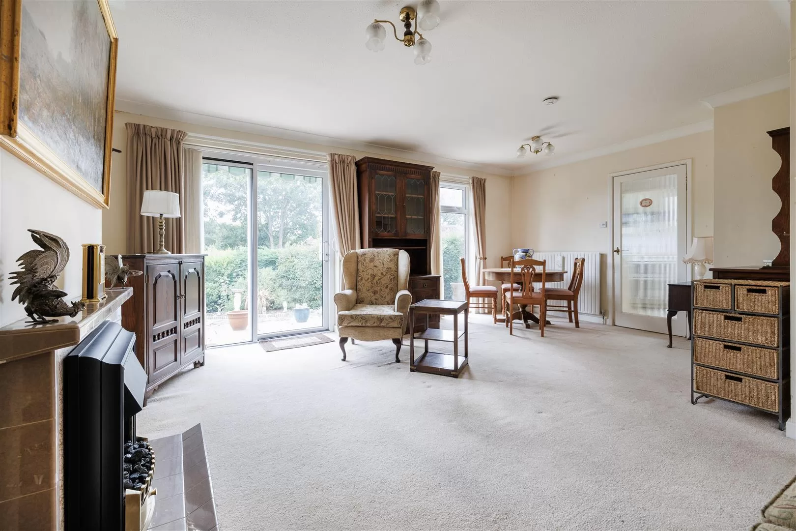 At the end of the hallway, you’ll find the main sitting and dining room. This space has sliding doors that open directly to the garden, a large full-length window that lets in plenty of light, and a fireplace that acts as a central feature. Just off the dining area is the kitchen, which is fitted with a good number of both wall and base units, giving plenty of storage. From the kitchen, there is also a door that leads outside.