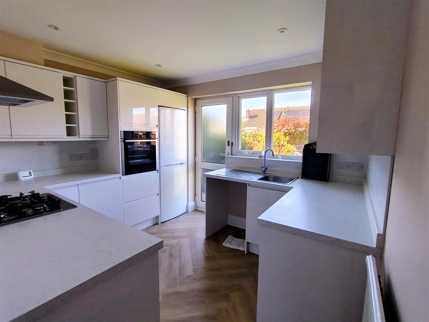 Step inside via the welcoming entrance hall, complete with two handy storage cupboards and doors leading to all rooms. The generous dual-aspect lounge/dining room is a standout feature, enjoying a red brick fireplace with gas coal-effect fire and sliding doors opening directly onto the rear garden. The stylish, modern kitchen has been fully refitted with a range of wall and base units, inset sink, eye-level oven, four-ring gas hob, and ample work surfaces, with a door providing further access to the garden.