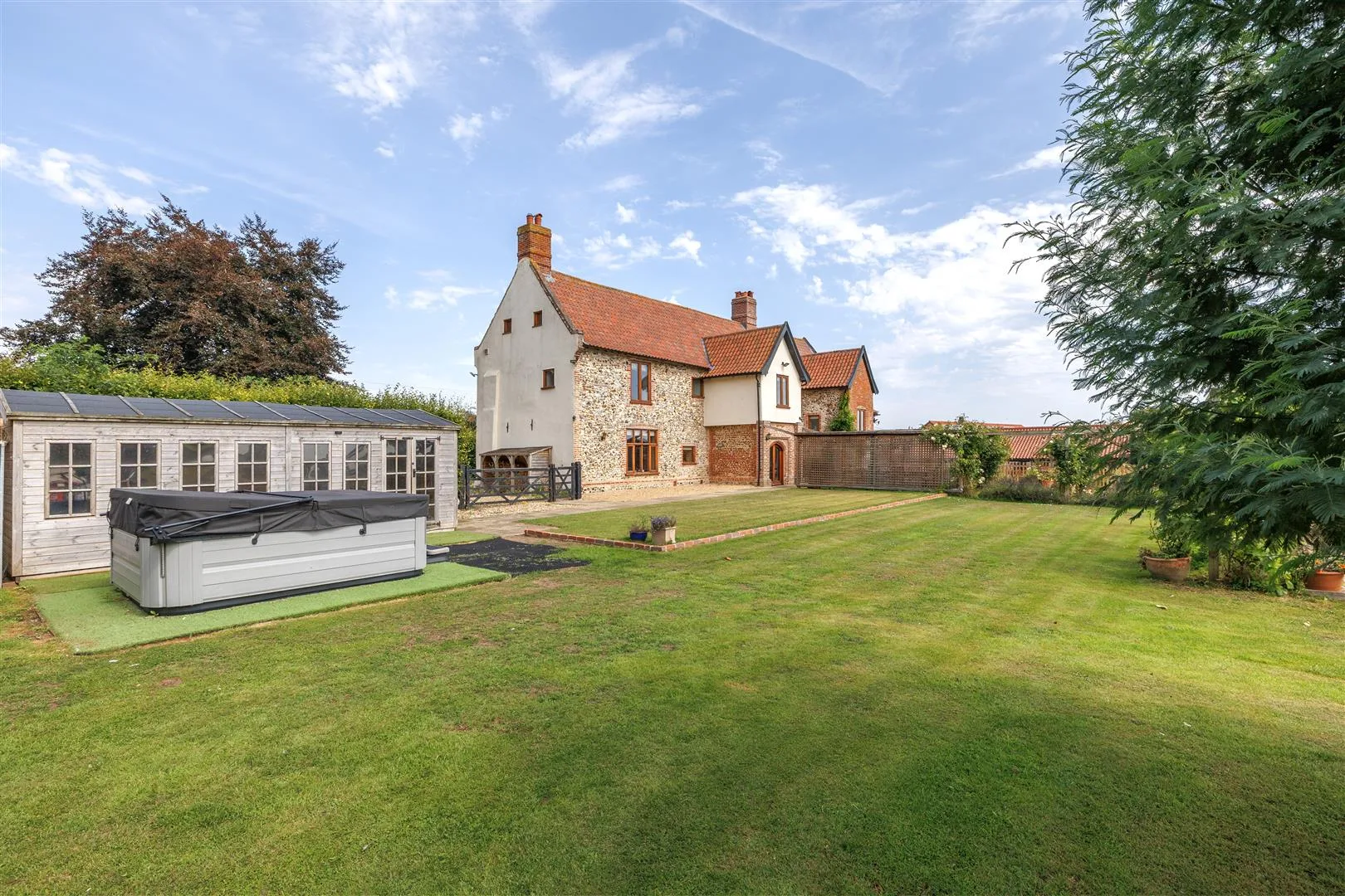 The architecture bears hallmarks of its age: the use of local flint and hand-made brickwork reflects both the materials and craftsmanship of the period, while later sympathetic additions and restorations have ensured that the building has not only survived but flourished as a family home through the passing generations. Exposed beams, some likely hewn from ancient oak, large inglenook fireplaces, and the graceful proportions of its principal rooms speak to the quality of the original construction and the care taken in its preservation.