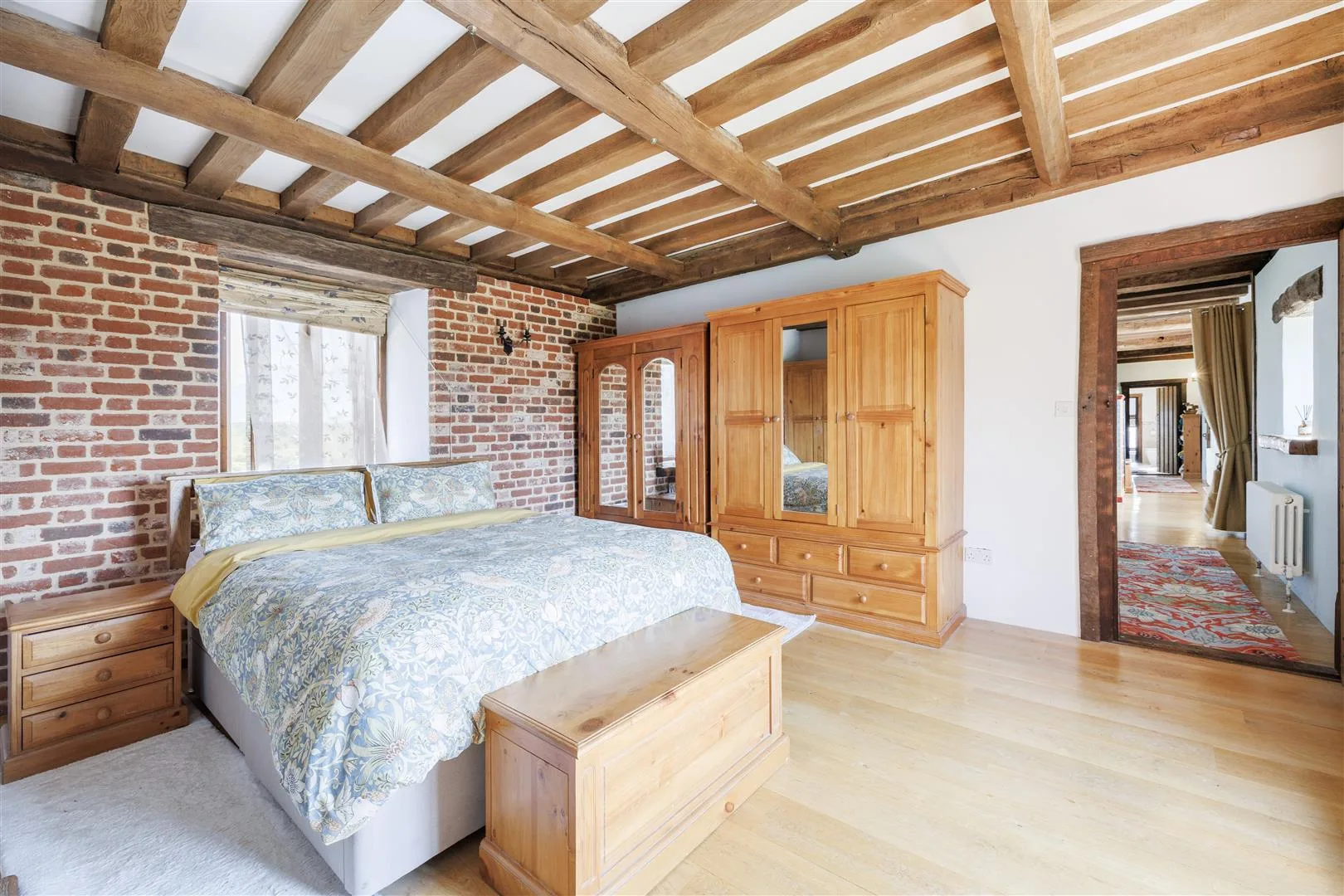 Ascending to the first floor, five bedrooms radiate from the landing, each imbued with character through features such as exposed beams, historic window details, and unique layouts that reflect the home’s rich history. Two of the bedrooms enjoy the benefit of en-suite facilities, while a spacious main bathroom is ideally positioned adjacent to the master bedroom. Further flexibility is provided by a Jack and Jill shower room, designed to serve either family members or guests with ease.