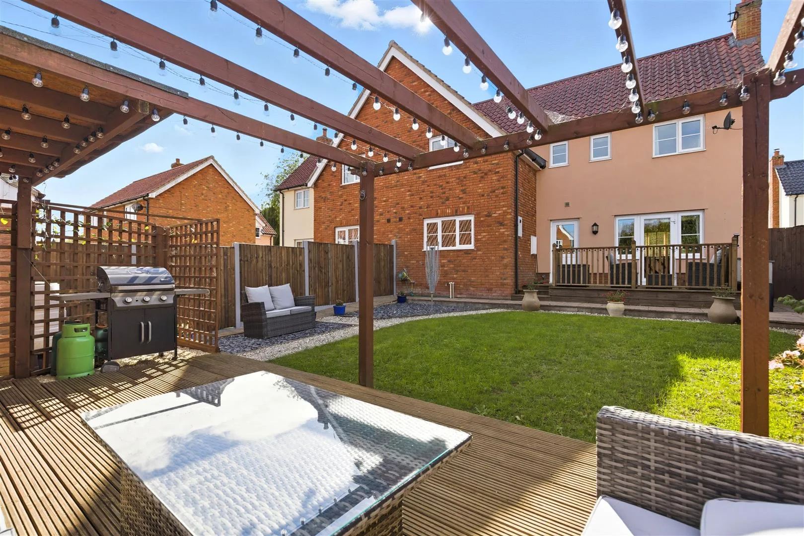 The property features ample off-road parking with a brick-paved driveway at the front, offering space for multiple vehicles. A secondary driveway provides access to the attached garage, complete with an additional parking space. The rear garden is a beautifully landscaped retreat, accessible from the garage. It boasts a large decked terrace directly off the house, with steps leading down to a well-maintained lawn. A gravel path leads to another charming decked area. The garden is fully enclosed by wooden panel fencing and includes a convenient side gate and oil tank.