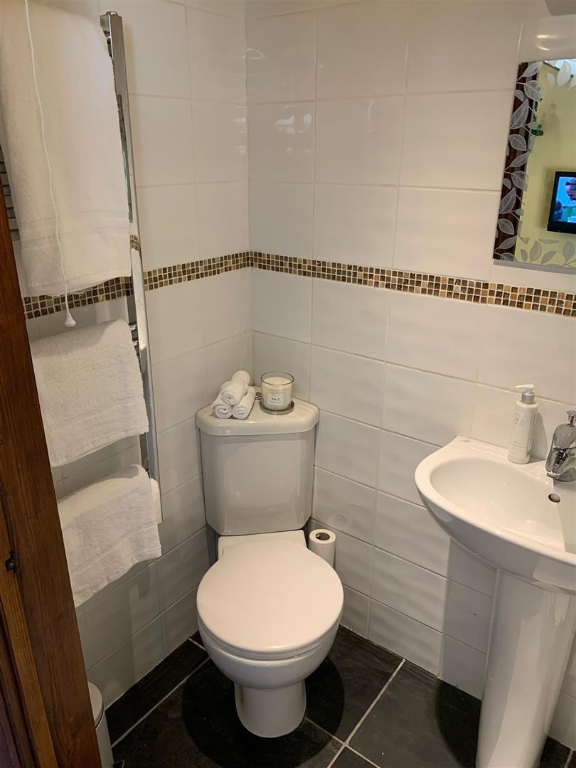 Tiled Floor, Tiled Walls, WC, Wash Hand Basin, Shower Cubicle, Towel Radiator.
