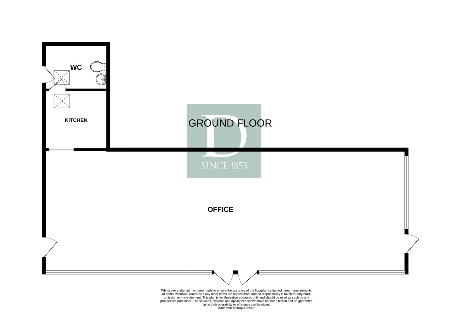 The space comprises three rooms, with the office/work space being the largest at 16.6m x 5.6m. To one end of this space, you will find a small kitchen and also a wc.
