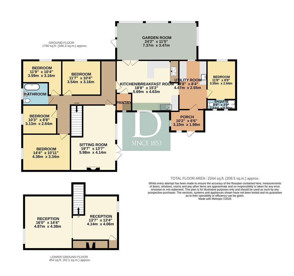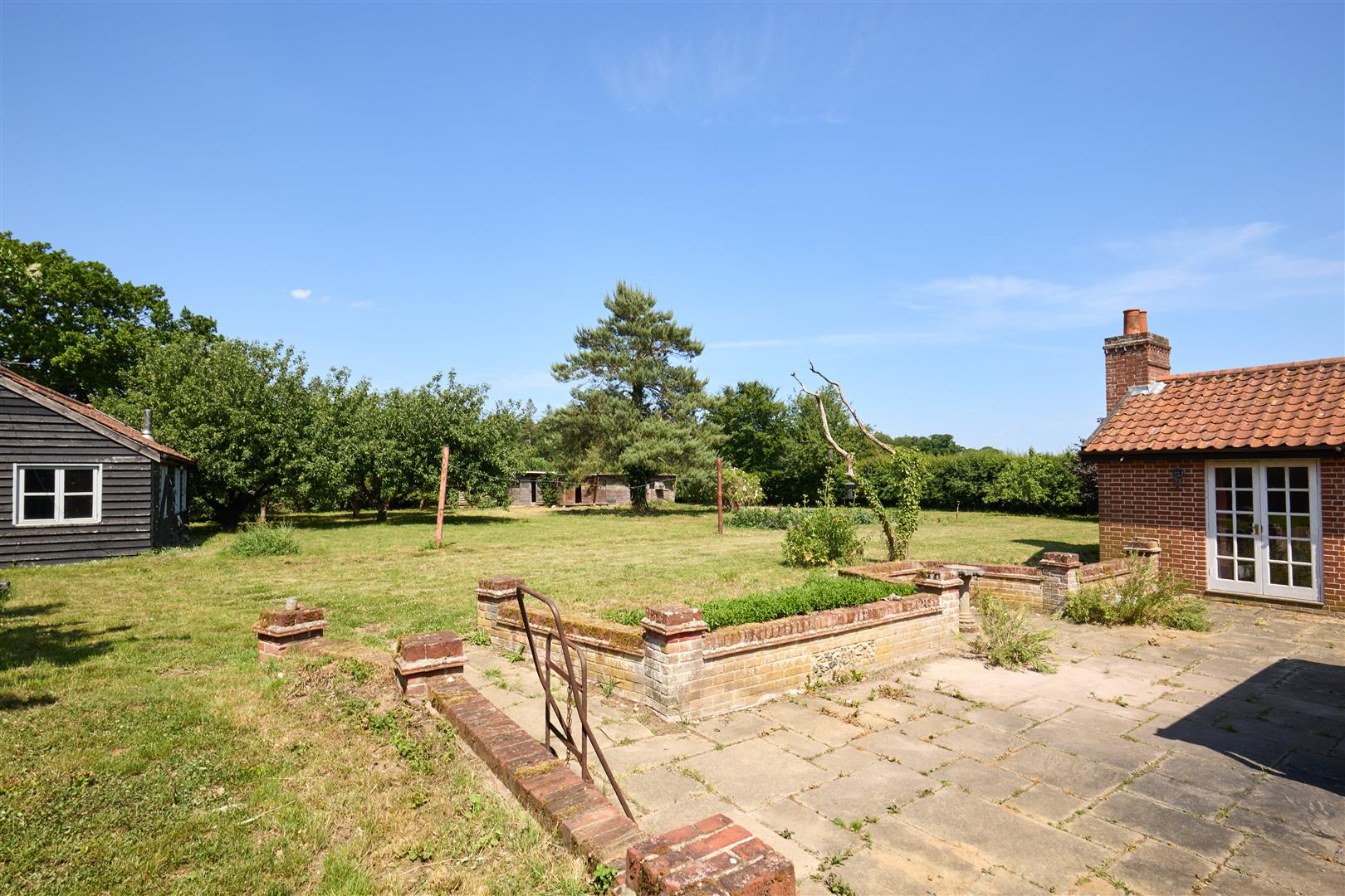 The front door opens into a triple aspect garden room with exposed flint wall to one side. Double doors lead into the spacious kitchen/breakfast room with, pantry and solid fuel range that supplies the central heating. There is a sitting room to the rear with open fire and French doors to the patio. There are four bedrooms at one end of the property plus a bathroom. Stairs lead down from the inner hall to the lower ground floor which is currently open plan living space with a wood burner. Off the kitchen is a spacious utility room with door to the rear porch and access to the fifth bedroom with ensuite shower room.