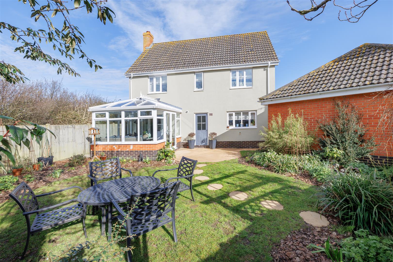 Outside, the property is approached via a driveway to the side of the house leading to a detached double garage, which offers excellent storage and potential for conversion into a gym or office space, subject to the necessary permissions. A pathway leads to the front door and is complemented by an attractive range of plant and shrub borders.