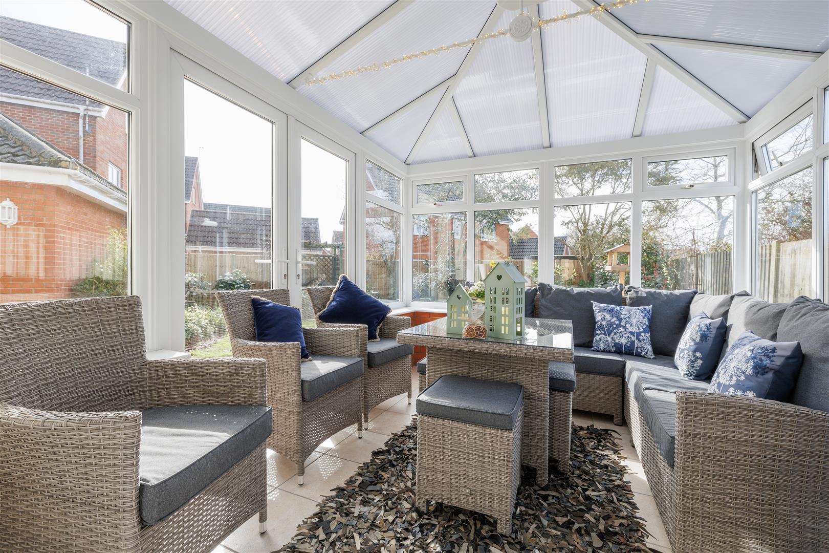 The accommodation begins with an entrance hall with stairs leading to the first floor and doors leading to the principal ground floor rooms. A cloakroom/WC is accessed from the hallway for added convenience. The sitting room enjoys a window to the front aspect and French doors leading through to the conservatory, creating a bright and comfortable living space. The conservatory overlooks the rear gardens and has doors opening out to the garden, providing an ideal area for relaxing or entertaining.