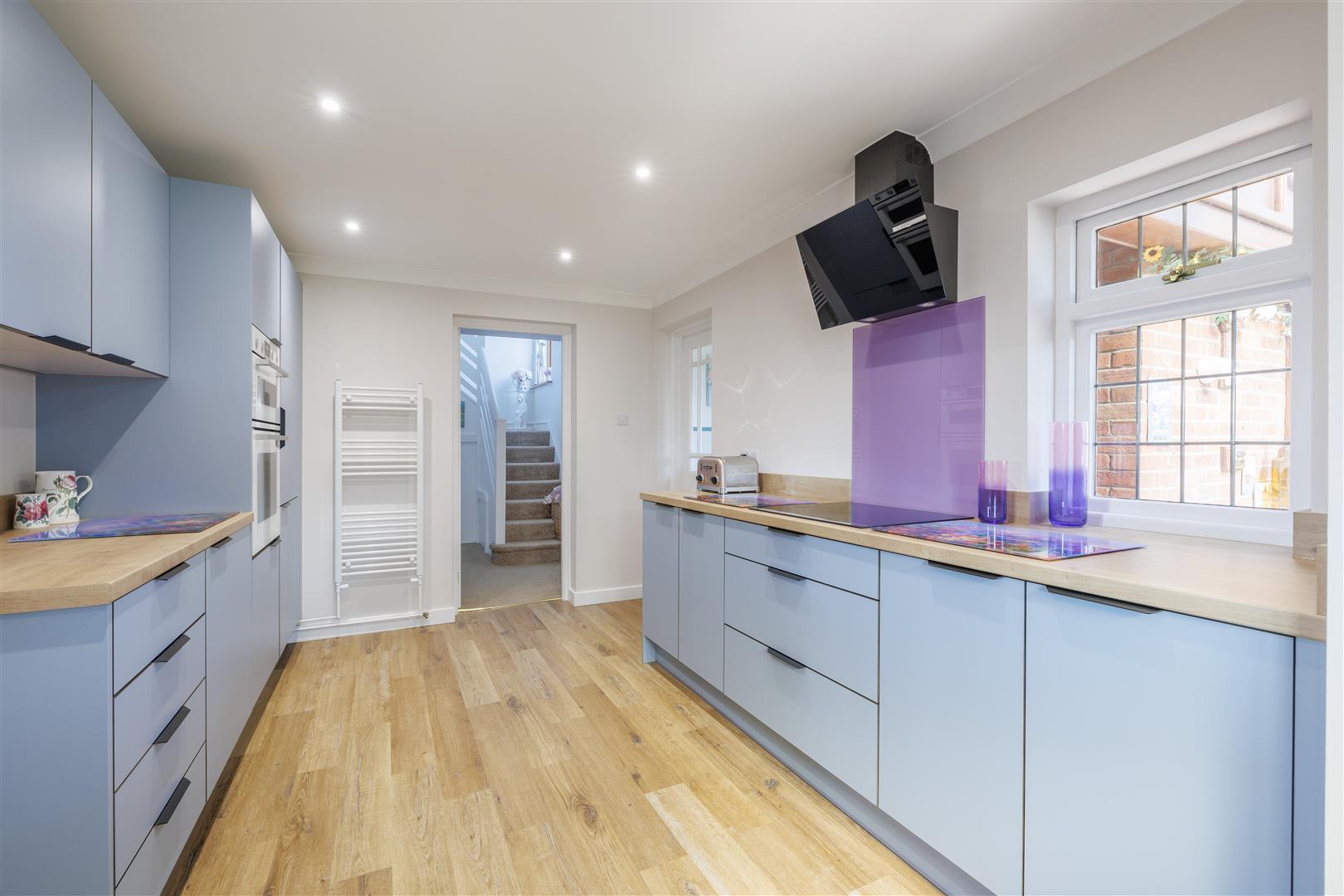 The property is entered via a welcoming front lobby which leads into an inner hallway with stairs rising to the first floor. Tucked neatly behind the staircase is a useful study area, complete with a window offering a pleasant view along the lane – an ideal space for home working.