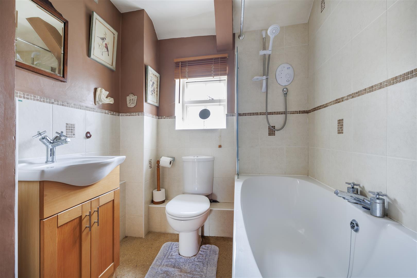 • Bathroom on first floor with bath with shower over, toilet and basin