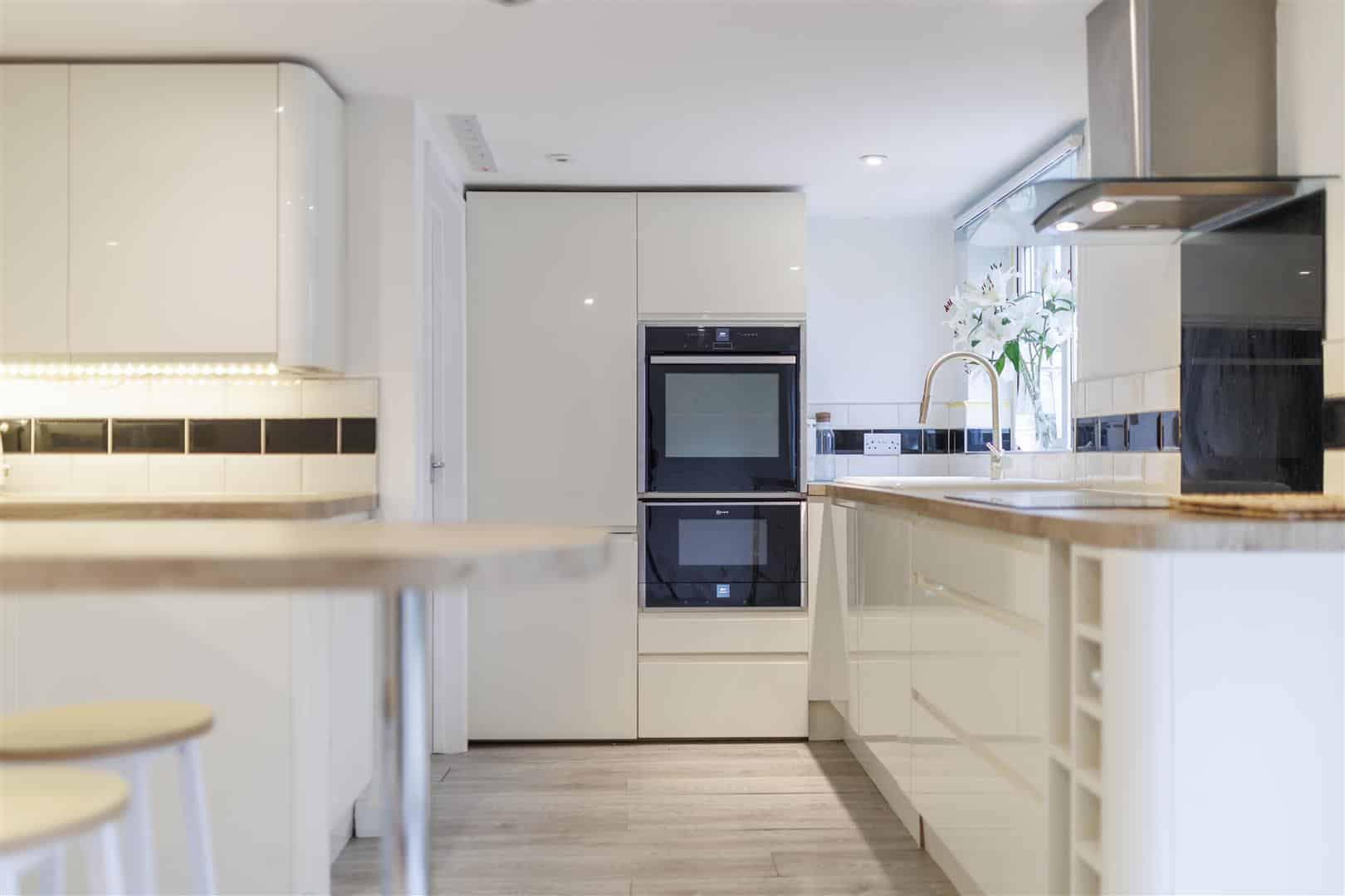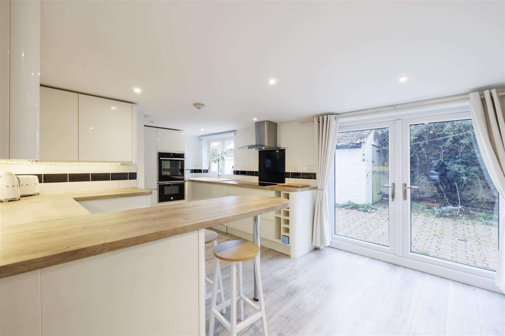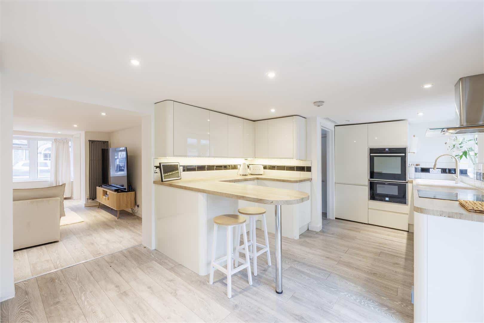 Upon entering, a welcoming entrance hall provides stairs rising to the first-floor landing. A door leads into the bay-fronted lounge, a bright and inviting space which seamlessly opens through to the bay-fronted dining room/second reception room — perfect for entertaining or flexible family living. An additional opening from the lounge leads into the well-appointed kitchen/breakfast room, fitted with a range of wall and base units, an eye-level double oven, and a breakfast bar. French doors and a rear-facing window allow for plenty of natural light and provide access to the rear garden. A door from the kitchen leads to a convenient ground floor WC.