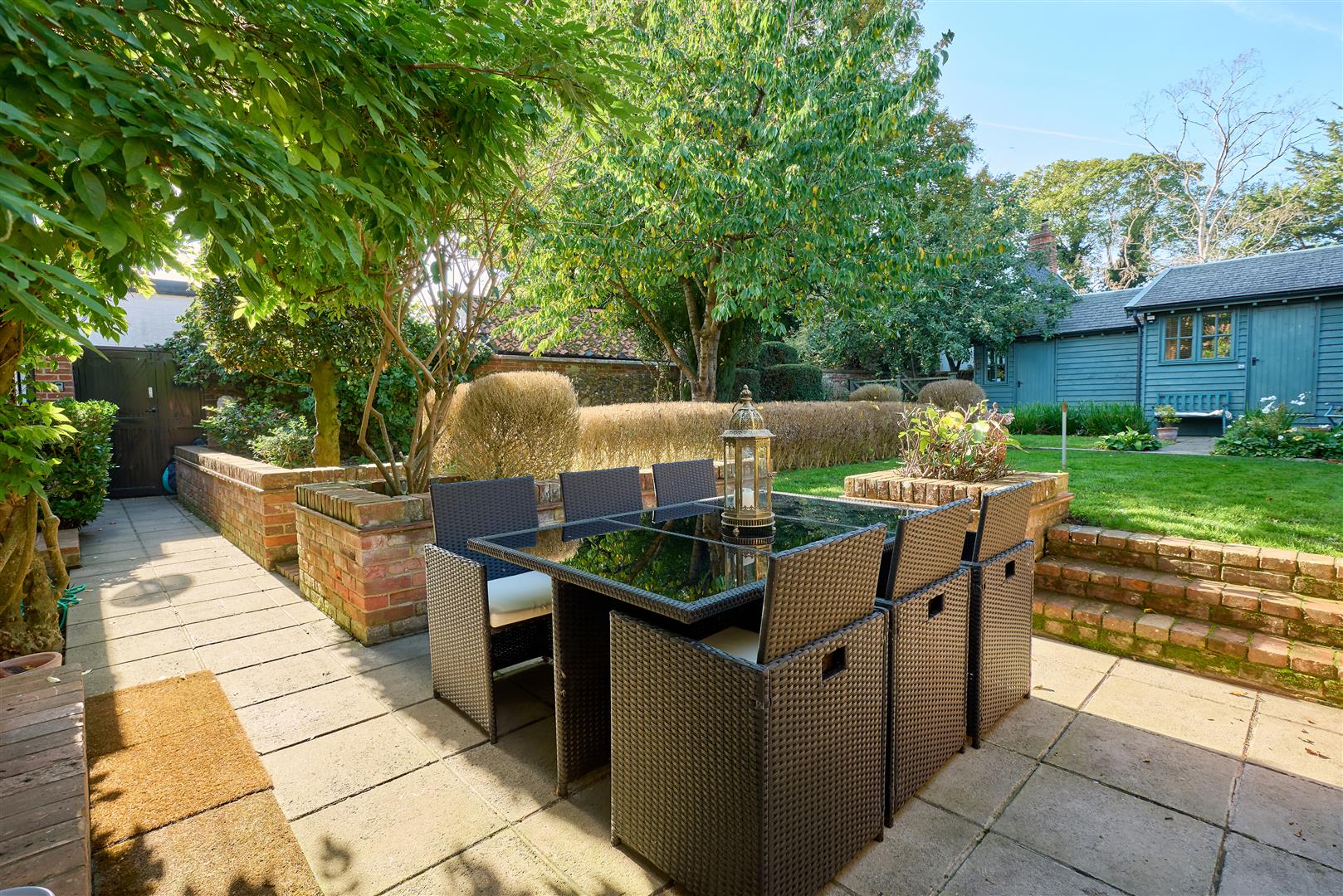 The beautifully landscaped rear garden features lawns divided by box-hedged paths leading to a workshop and home office/studio, both with power and lighting. Mature trees, flowers, and shrubs provide a tranquil setting, with side gates giving access to Mount Street.