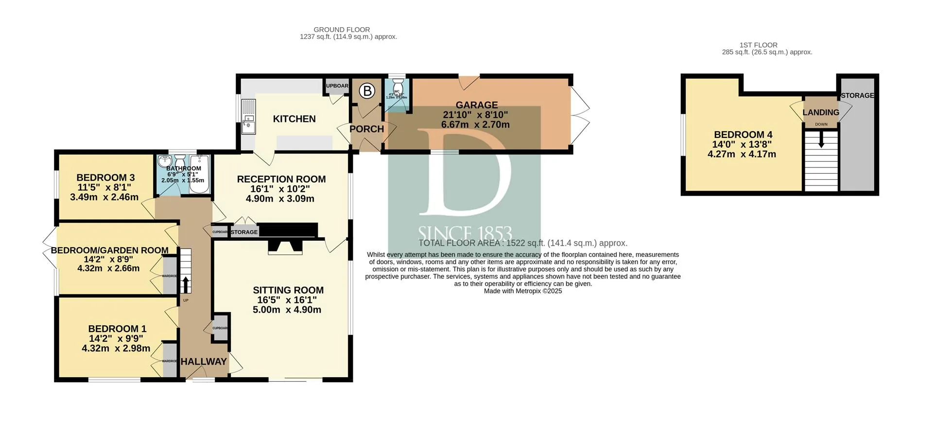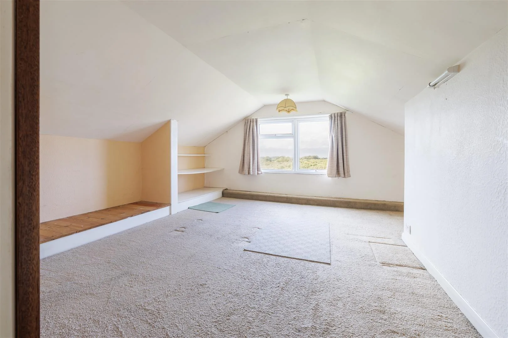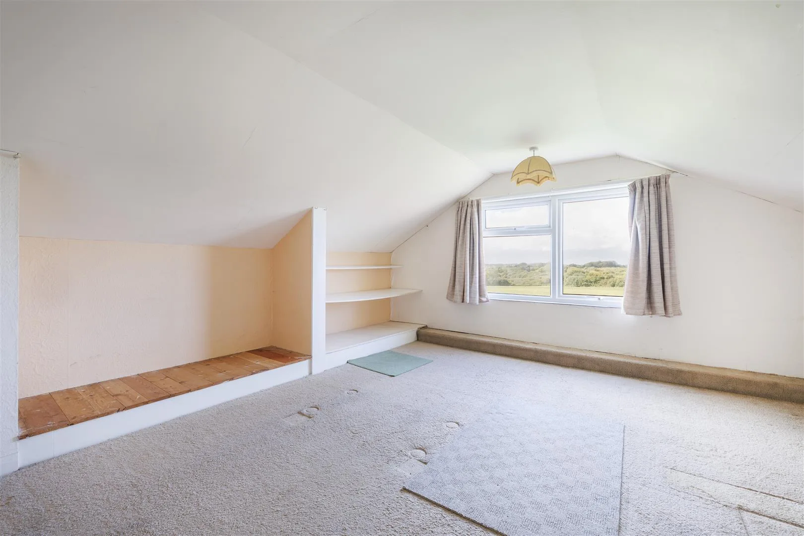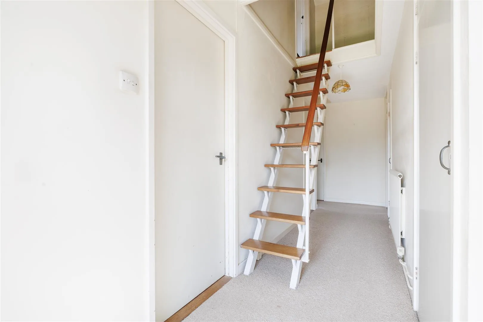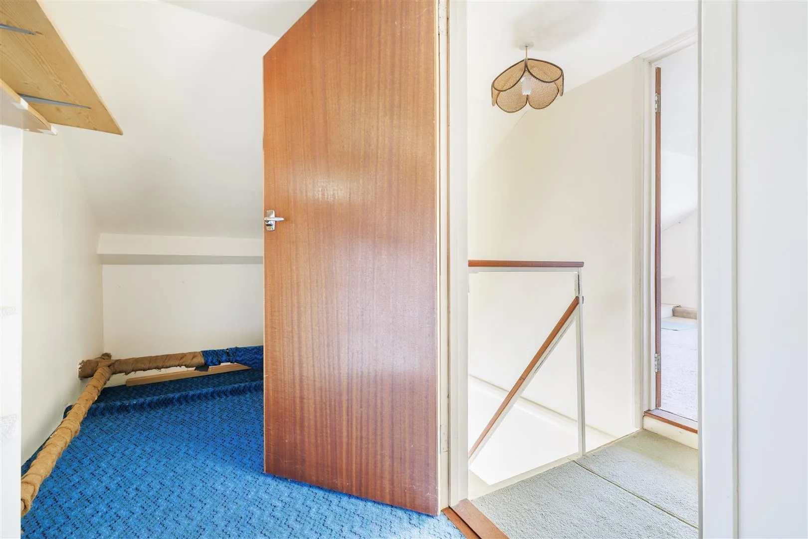 The bathroom includes a bath, basin, and toilet. From the hallway, steps lead up to the first floor, where you will find an additional double bedroom with views over the garden, along with a handy storage room in the attic space.