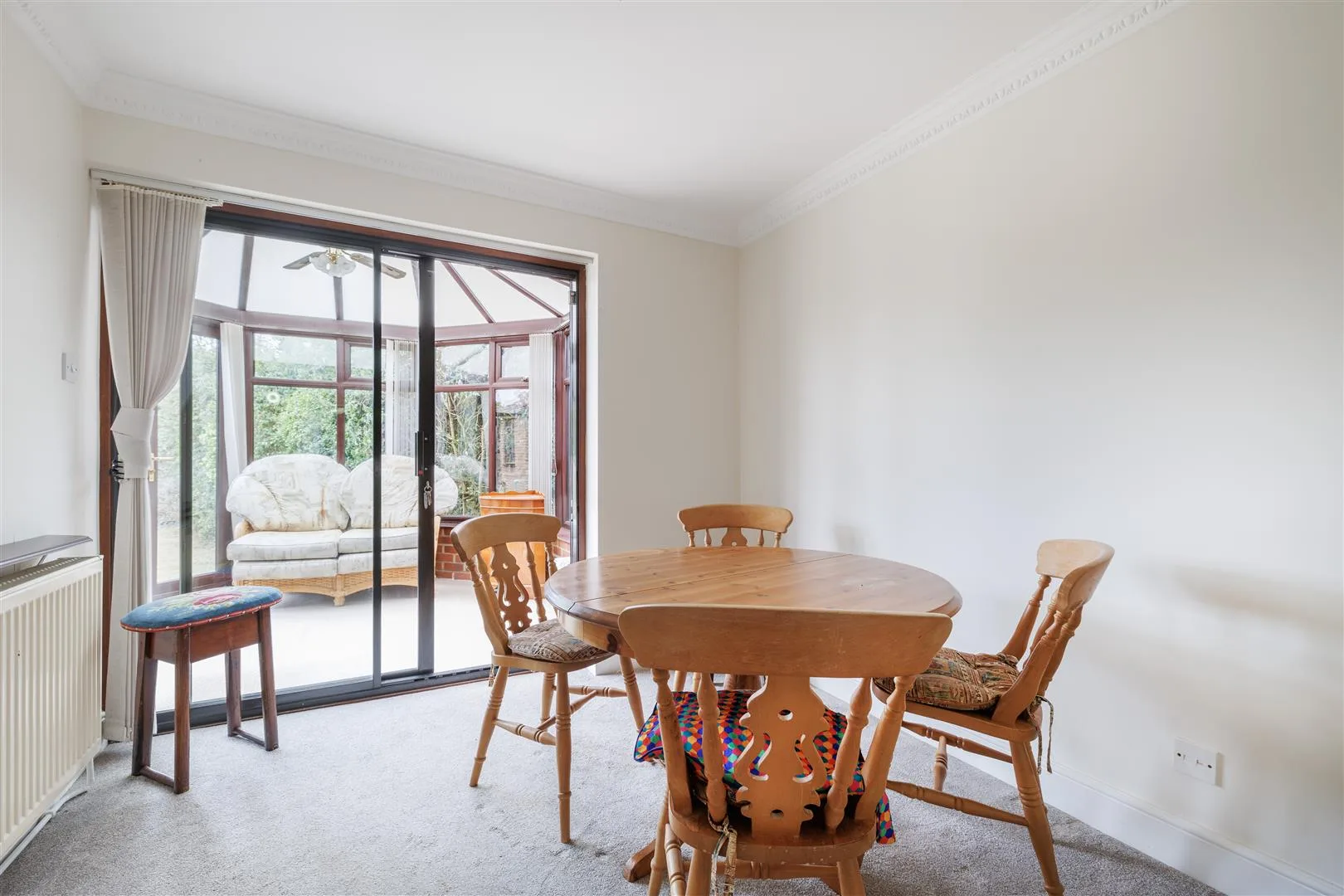 Upon entering, the property features a welcoming entrance hallway with two convenient built-in storage cupboards. The kitchen, which provides direct access to the rear garden, adjoins a useful additional reception room—ideal as a dining area or informal family space. A bright and airy conservatory offers a pleasant spot to relax and enjoy views of the garden throughout the year.