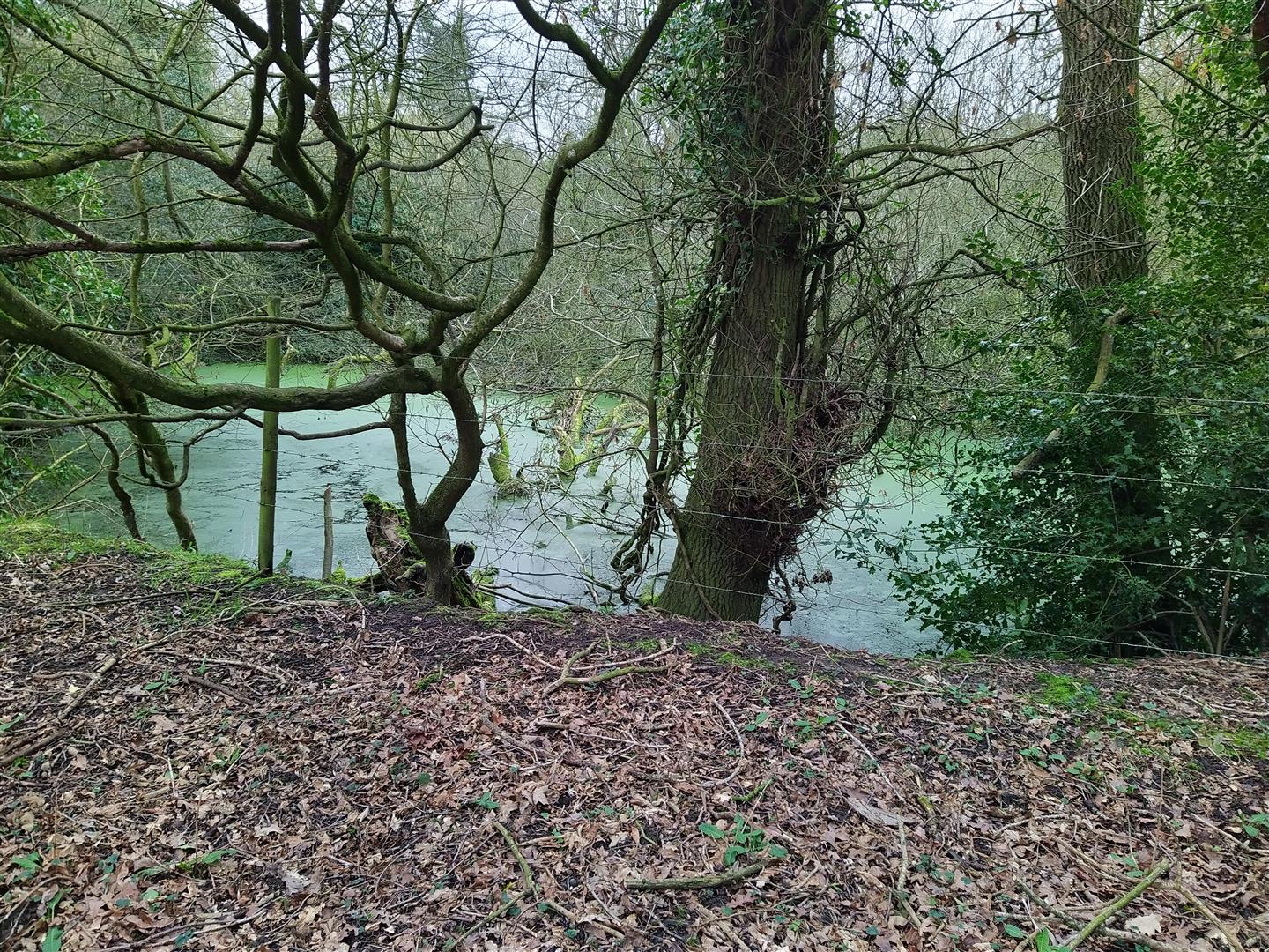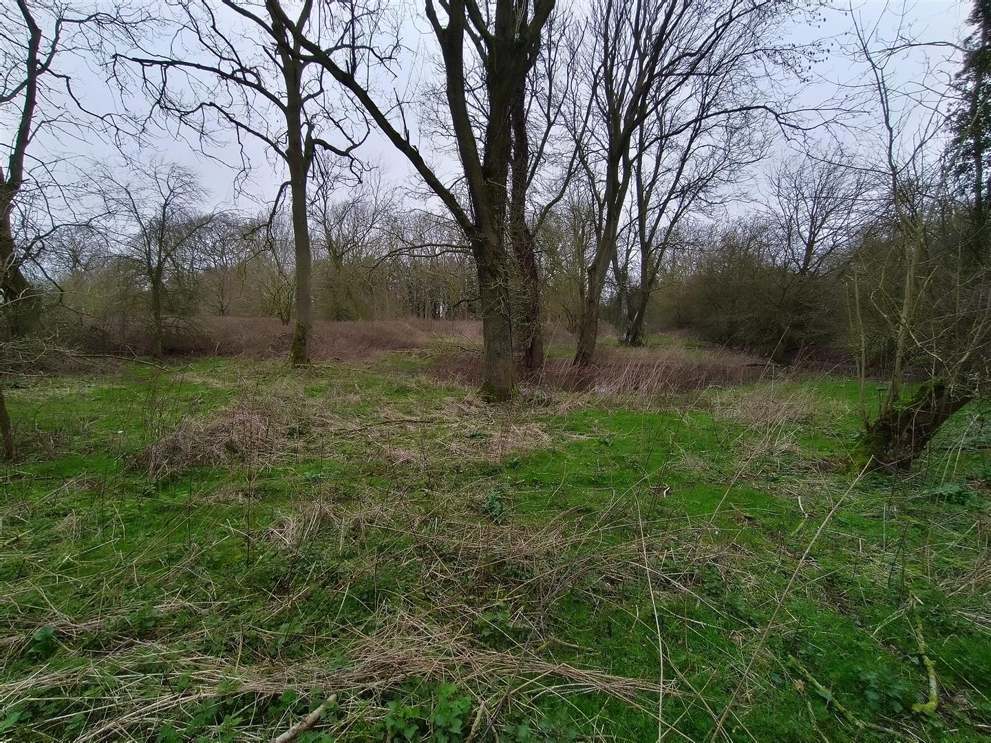 The land is uneven underfoot with significant overgrown foliage and some fallen trees.