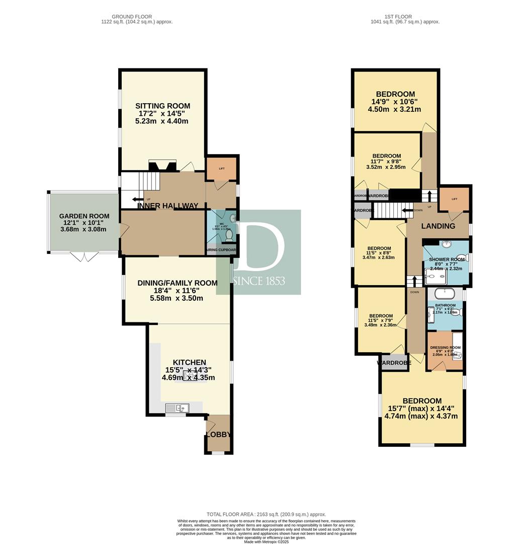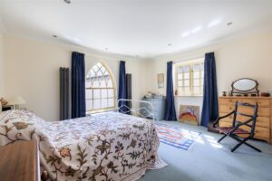 Upstairs, a spacious landing stretches front to back, giving access to five well-appointed bedrooms and a modern family shower room. The master suite stands out with its striking arched window, separate dressing area, and a stylish en-suite bathroom. The lift opens directly onto the landing for added accessibility.