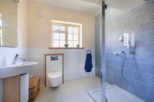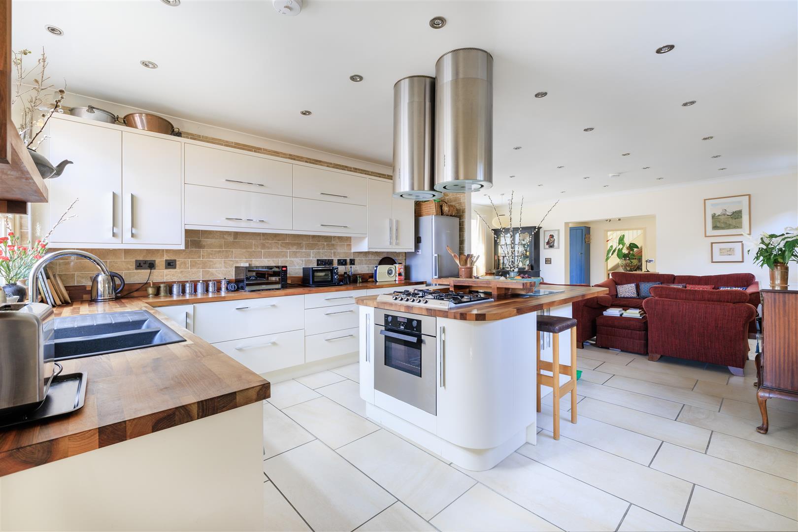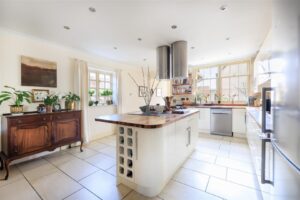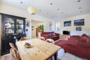 Inside, the welcoming lobby opens into a stunning open-plan kitchen/dining/family room — the true heart of the home — with views across the garden. This space flows through to an inner hallway with access to a charming garden room, a ground floor WC, and a lift providing convenient access to the first floor. A staircase also rises from this area.