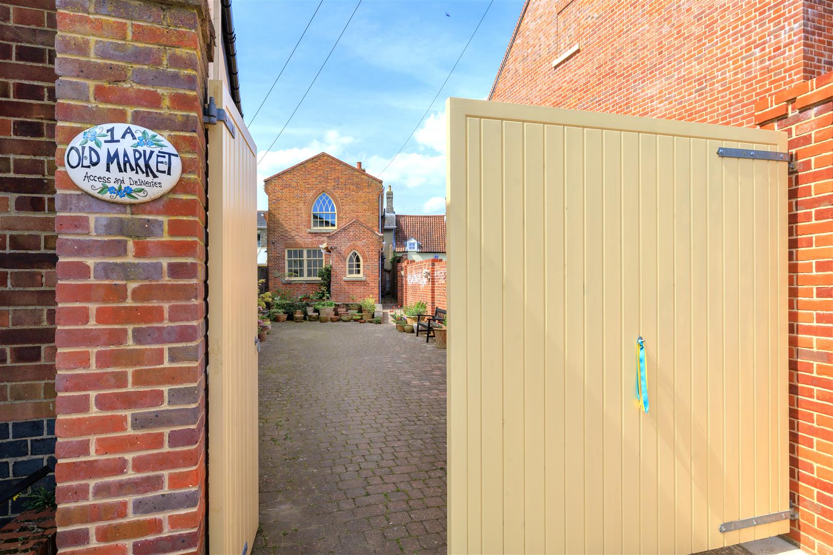 Accessed via Newgate through double gates, the property features a private paved parking area. A pathway leads through the well-established, south-facing garden, with additional access to the rear for easy maintenance.