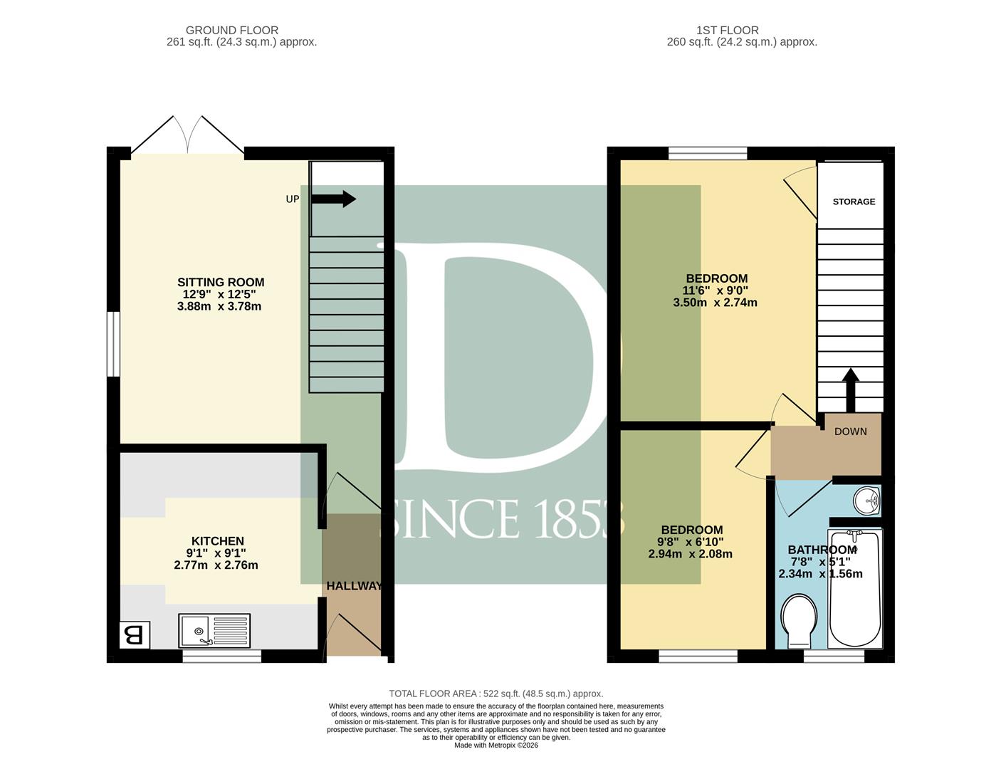 Stairs rise from the living room to the first floor leading to two bedrooms, the principal double bedroom with built in storage, overlooks the rear garden and the second single bedroom is situated to the front of the home. The accommodation is completed with a family bathroom.