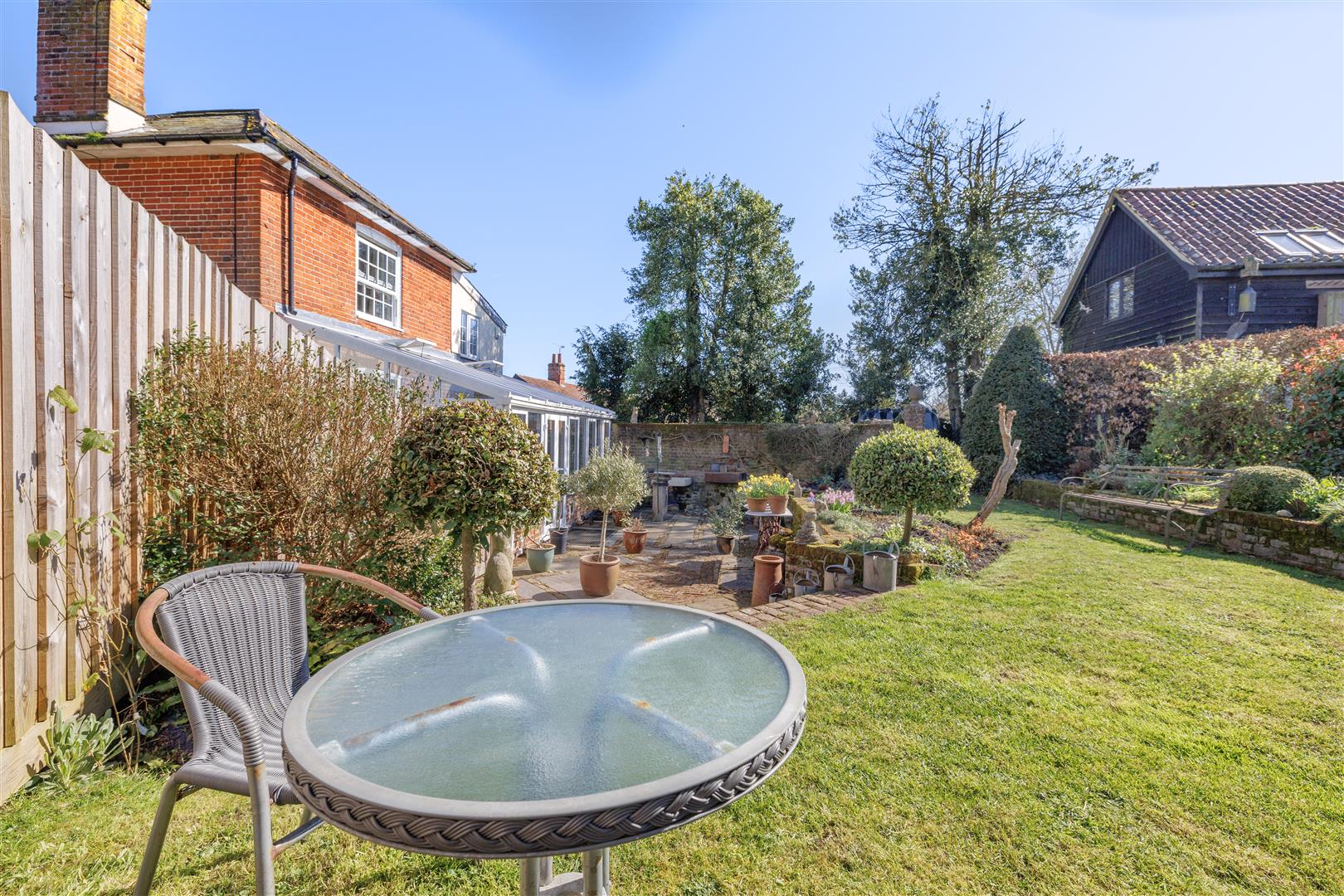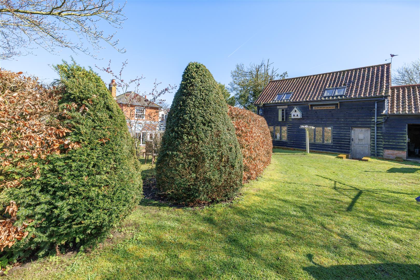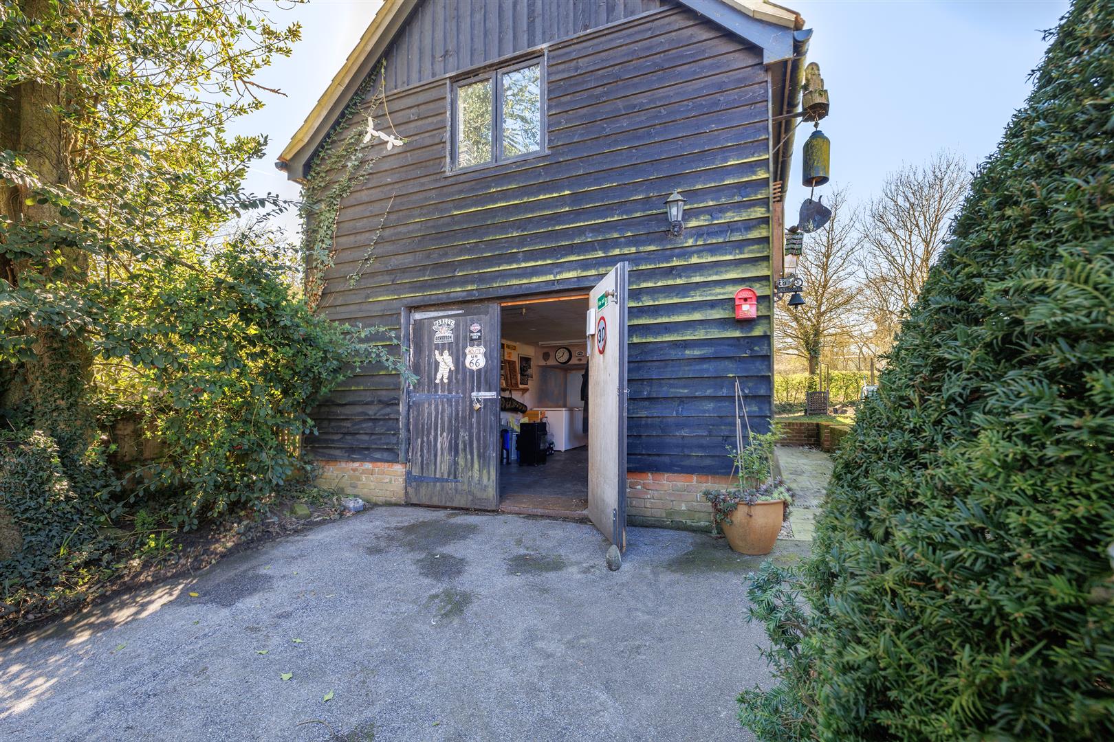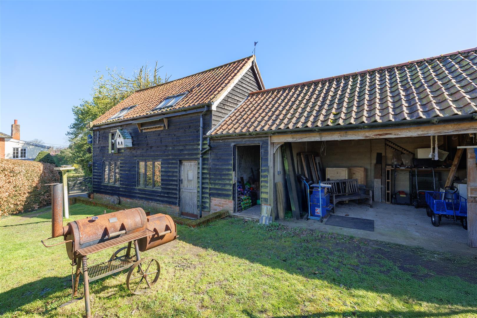 Externally, the property continues to impress with ample off-road parking provided via a generous driveway. The rear terraced garden is a particular highlight being well-sized and beautifully maintained, featuring mature shrubs, established flower beds and a peaceful private setting. Benefiting from a south facing aspect, it’s an ideal space to relax and enjoy the surrounding countryside, with open fields to the rear and the gentle sound of water from the pond adding to the tranquil atmosphere. To the rear of the garden and also accessible from the driveway is a substantial barn. This versatile space benefits from double doors opening onto the driveway, windows overlooking the garden, and a connected electricity supply perfect for a range of uses. Above this workshop is a useful hobby room, offering excellent potential as a home office, studio, or creative space. Further enhancing the outdoor space are the cart lodge, log store and lockable tool shed with electricity and water supply connected.