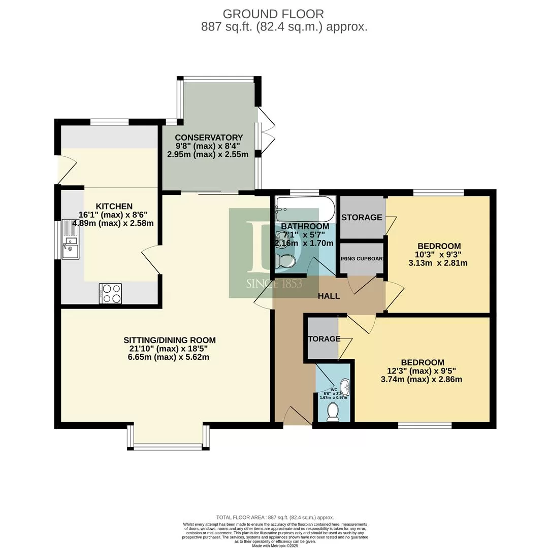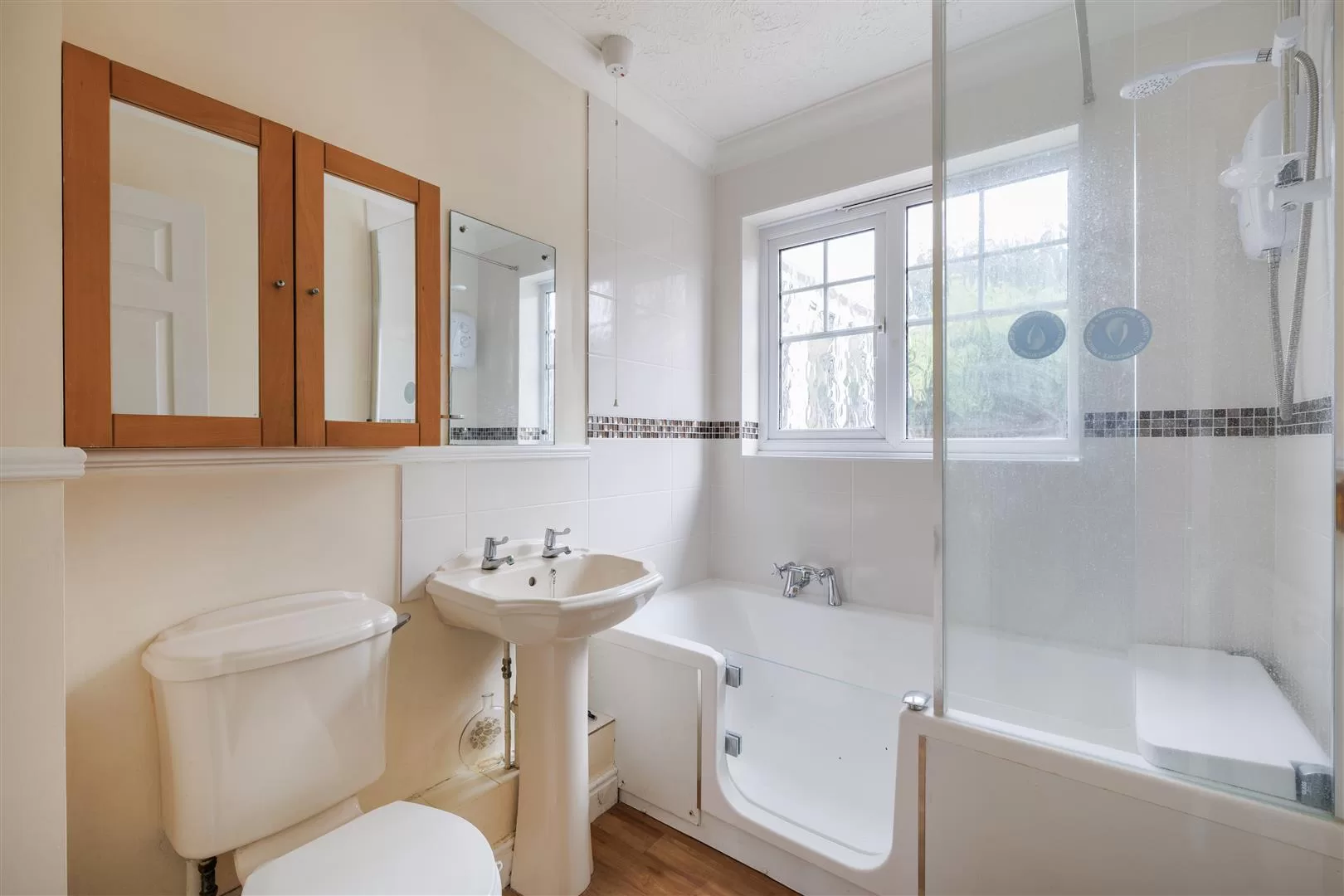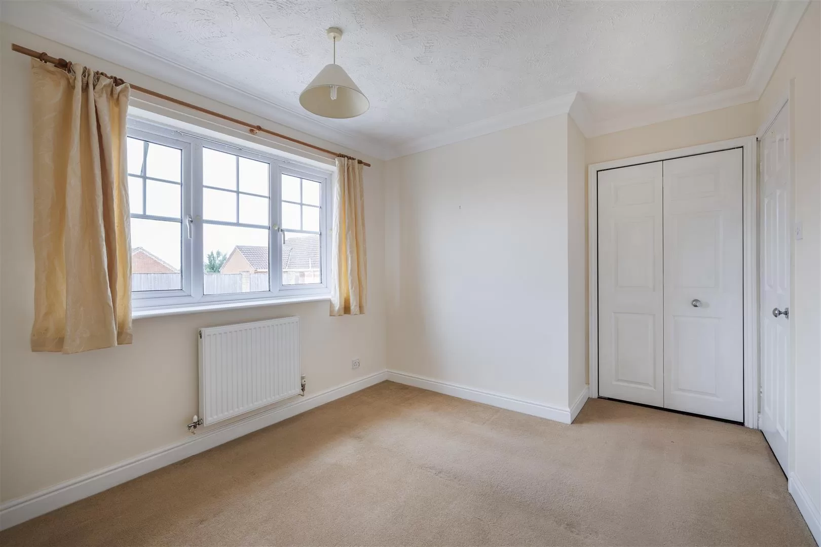 Both bedrooms are generously sized and include built-in storage cupboards. The master bedroom overlooks the front garden, while the second bedroom enjoys views of the rear garden. The accommodation is completed by a family bathroom, a separate WC, and an additional storage cupboard in the hallway.