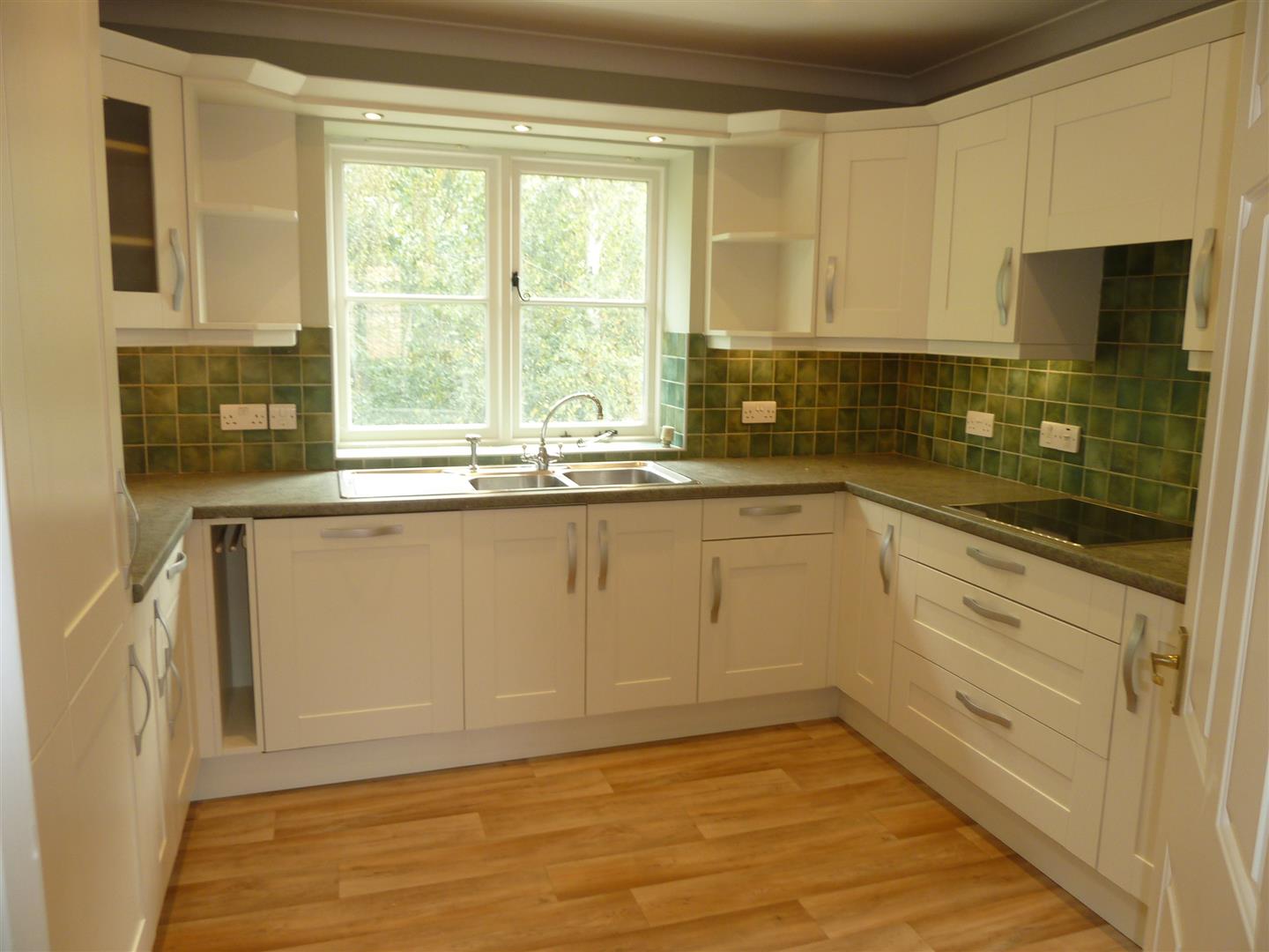 Wooden Floor, Radiator, Cream Wall and Base Units, Green Worktops, Stainless Steel Sink and Drainer Unit, Built in Electric Hob, Built in Electric Oven.