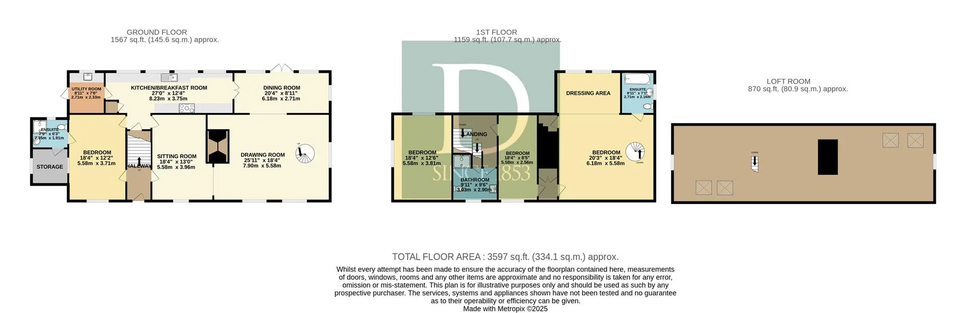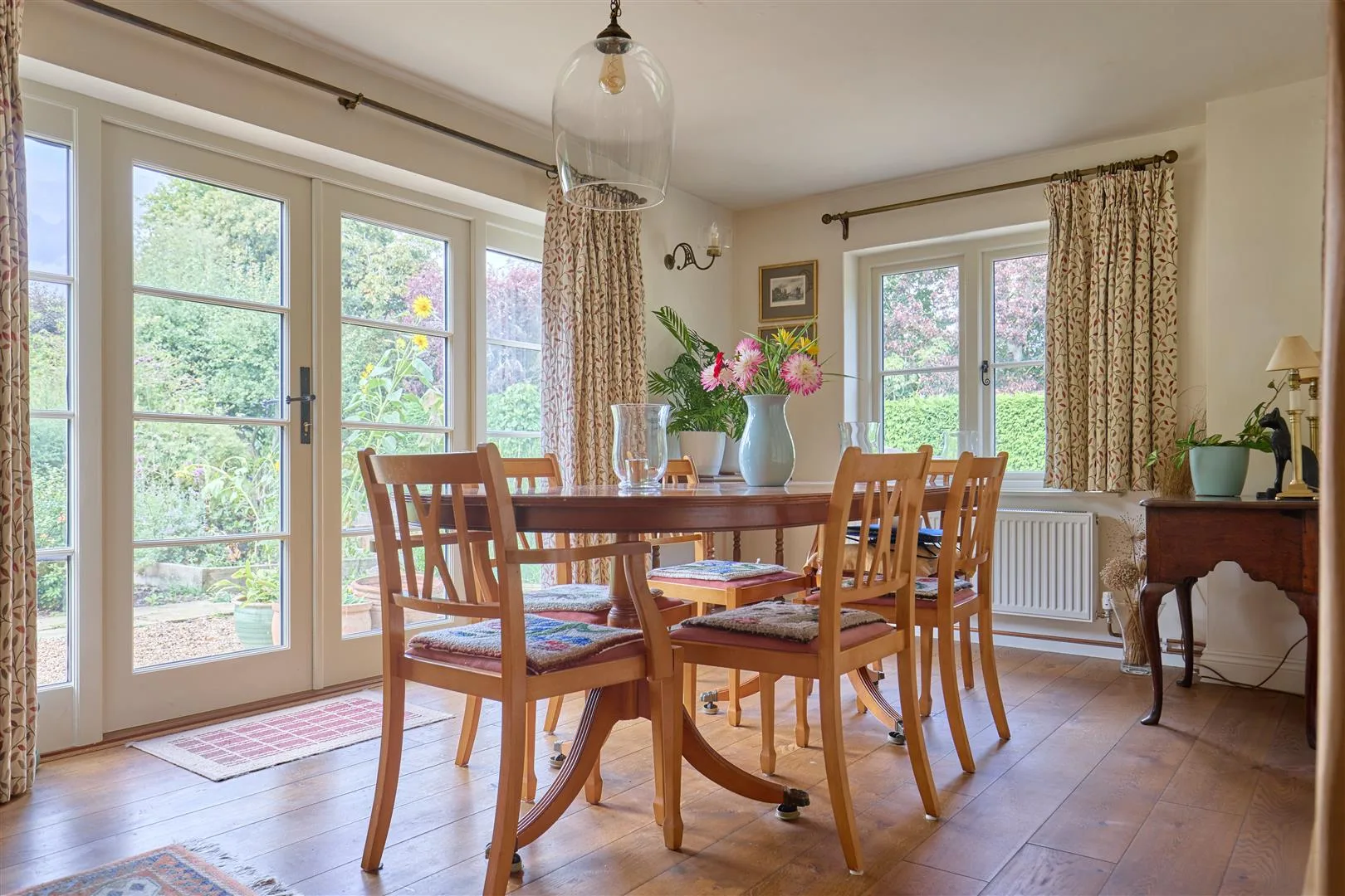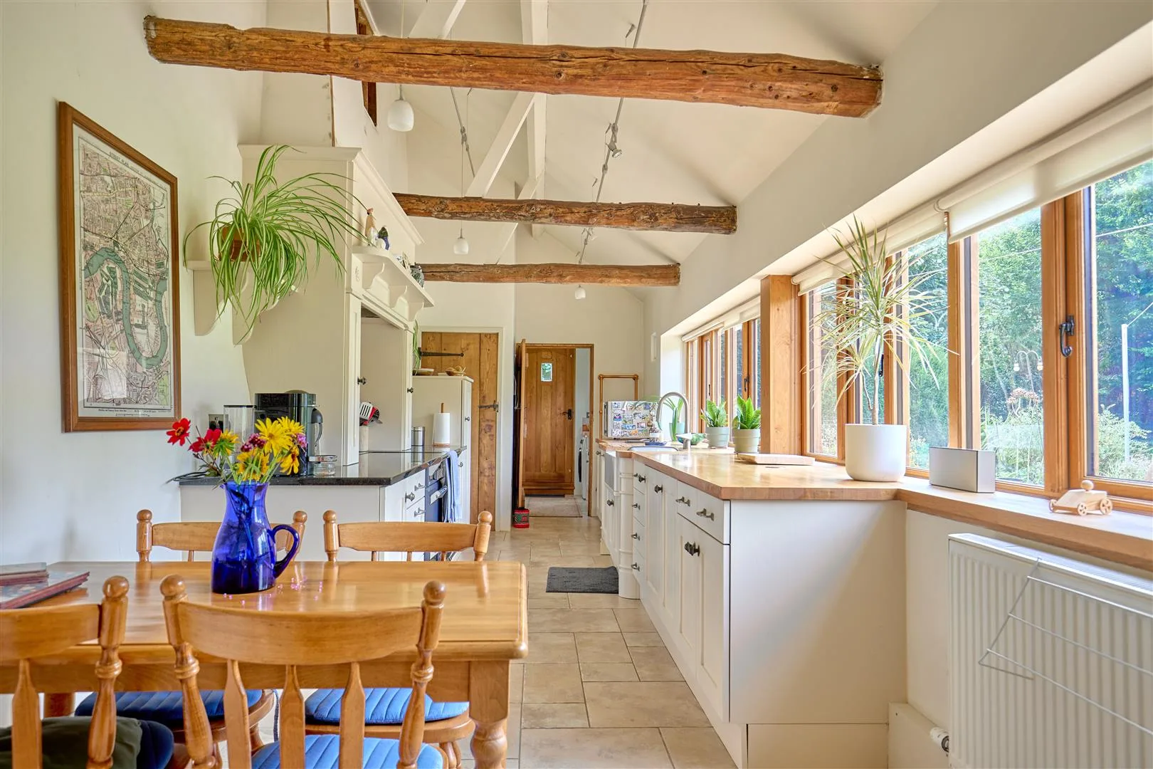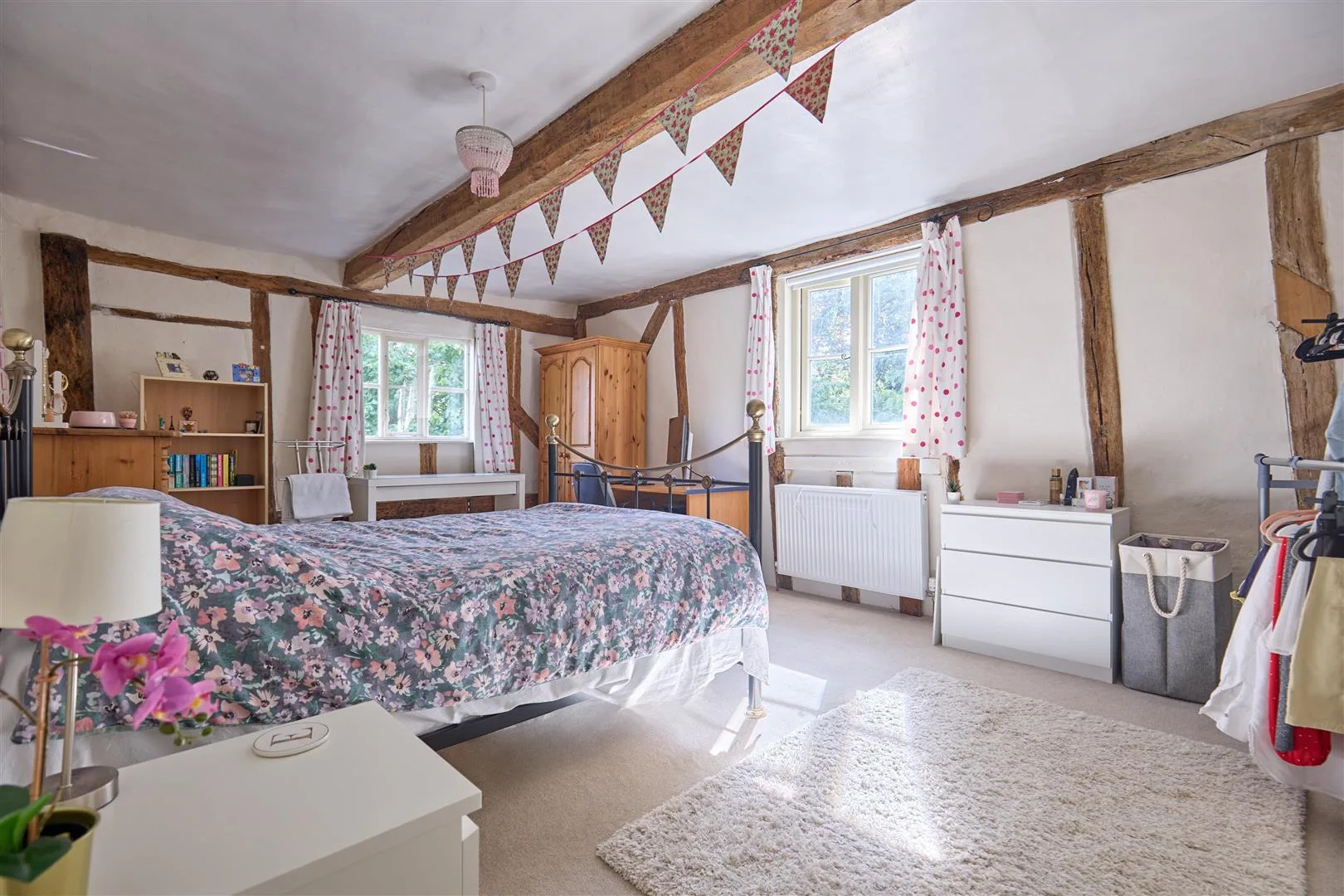 The front door opens to the entrance hall with stairs to the first floor. There is a door that leads to a ground floor bedroom suite which is ideal for future proofing. There is an attractive sitting room with feature fireplace and the room opens at one end into the superb drawing room with large inglenook fireplace with woodburning stove. There is a spiral staircase leading to the principal bedroom suite. The drawing room opens into a light-filled double aspect dining room with French doors to the garden and double doors to the kitchen/breakfast room. This is fitted with a comprehensive range of painted wooden wall and base units and has a delightful aspect over the garden. There is a useful utility room and a further store room. On the first floor the principal bedroom has a large dressing area and an ensuite bathroom and is filled with exposed timbers and character. There are two further double bedrooms and a family shower room. Stairs rise from the landing to an impressive loft room that could be used for a variety of purposes.