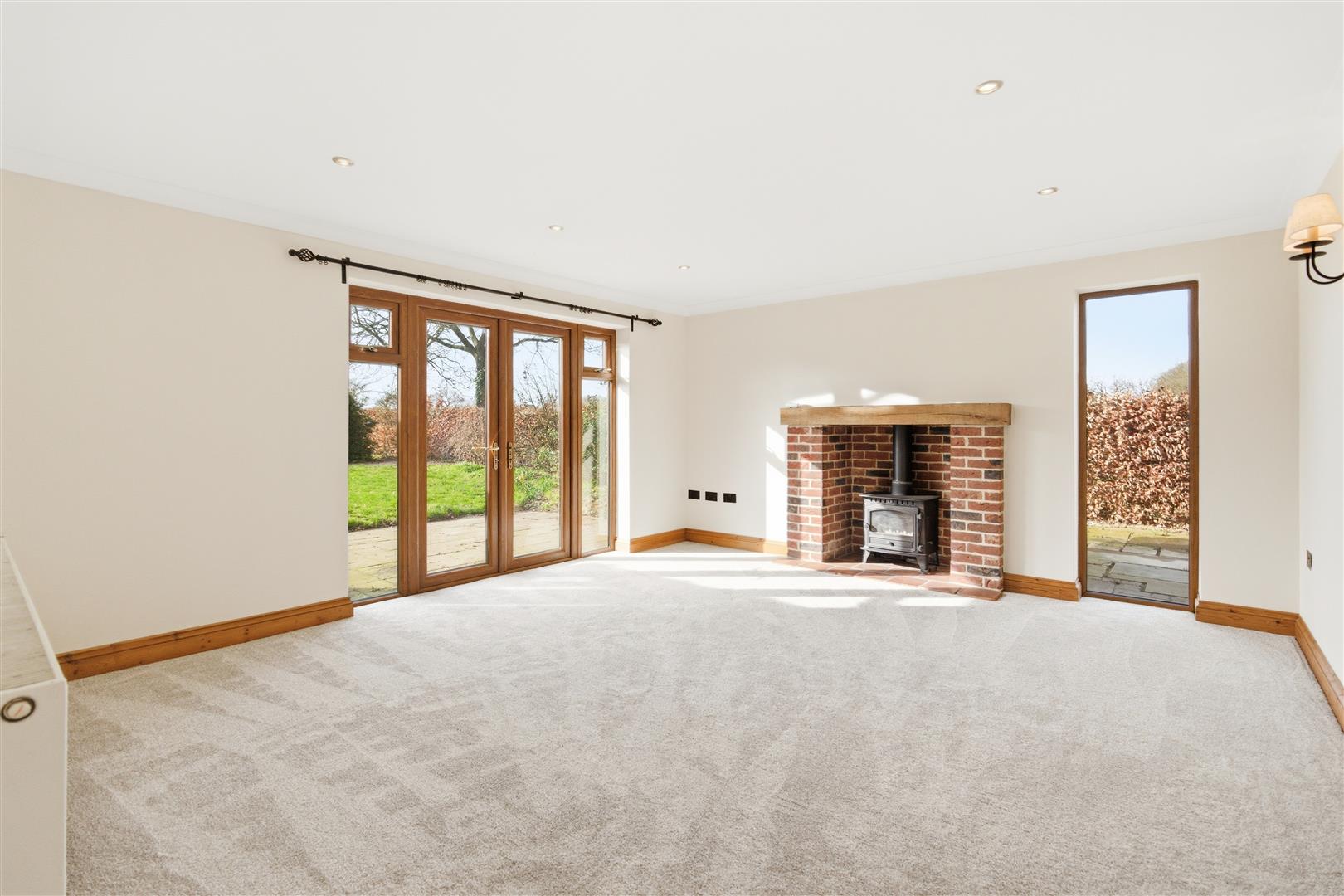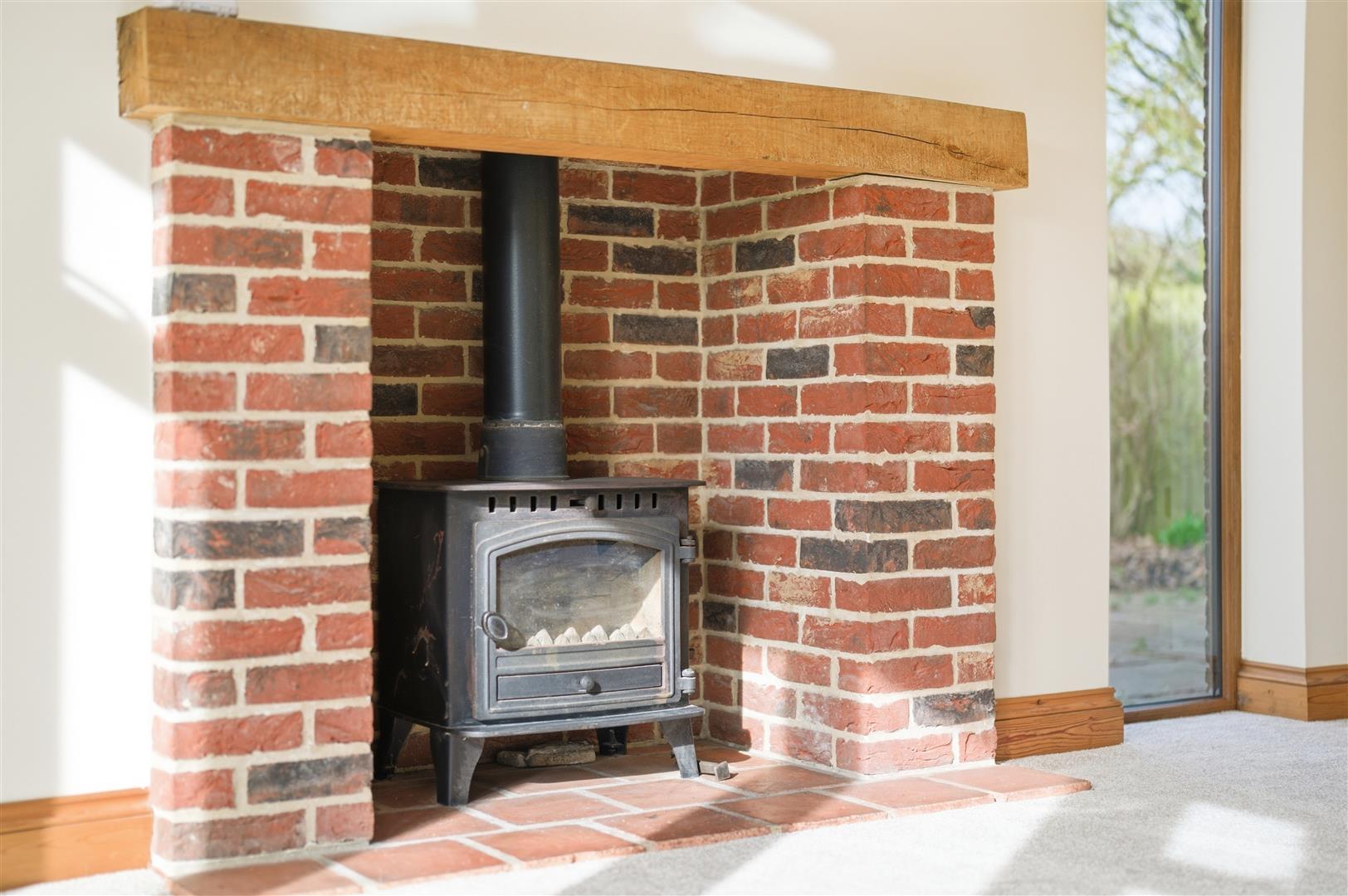 Entering the home, you are welcomed into a spacious entrance hall featuring elegant wooden flooring and built-in double storage cupboards. From here, doors lead to the bedrooms, bathroom, kitchen, and a light and airy sitting room. The sitting room is a particular highlight, with double doors opening onto the rear terrace and a striking red-brick fireplace housing a wood-burning stove, creating a warm and inviting focal point. The kitchen offers a range of wall and floor-mounted units with ample work surfaces, an inset 1½ bowl sink with drainer, a four-ring electric hob with oven beneath, and space and plumbing for a washing machine. From the kitchen, a door leads to the garden room – a glazed, brick-based construction with underfloor heating and double doors opening to the garden, perfect for enjoying the surrounding countryside.