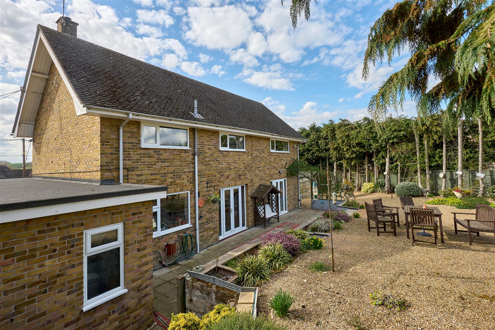 A sweeping drive rises to the property with a parking and turning area for several cars in front of the integral garage. There is a large front lawn edged with established borders. The rear garden is a delight. Immediately to the rear is a gravel terrace providing a lovely area for alfresco entertaining and it adjoins the lawn. The garden is bordered by mature trees and hedging and there is a range of established planting together with garden sheds.